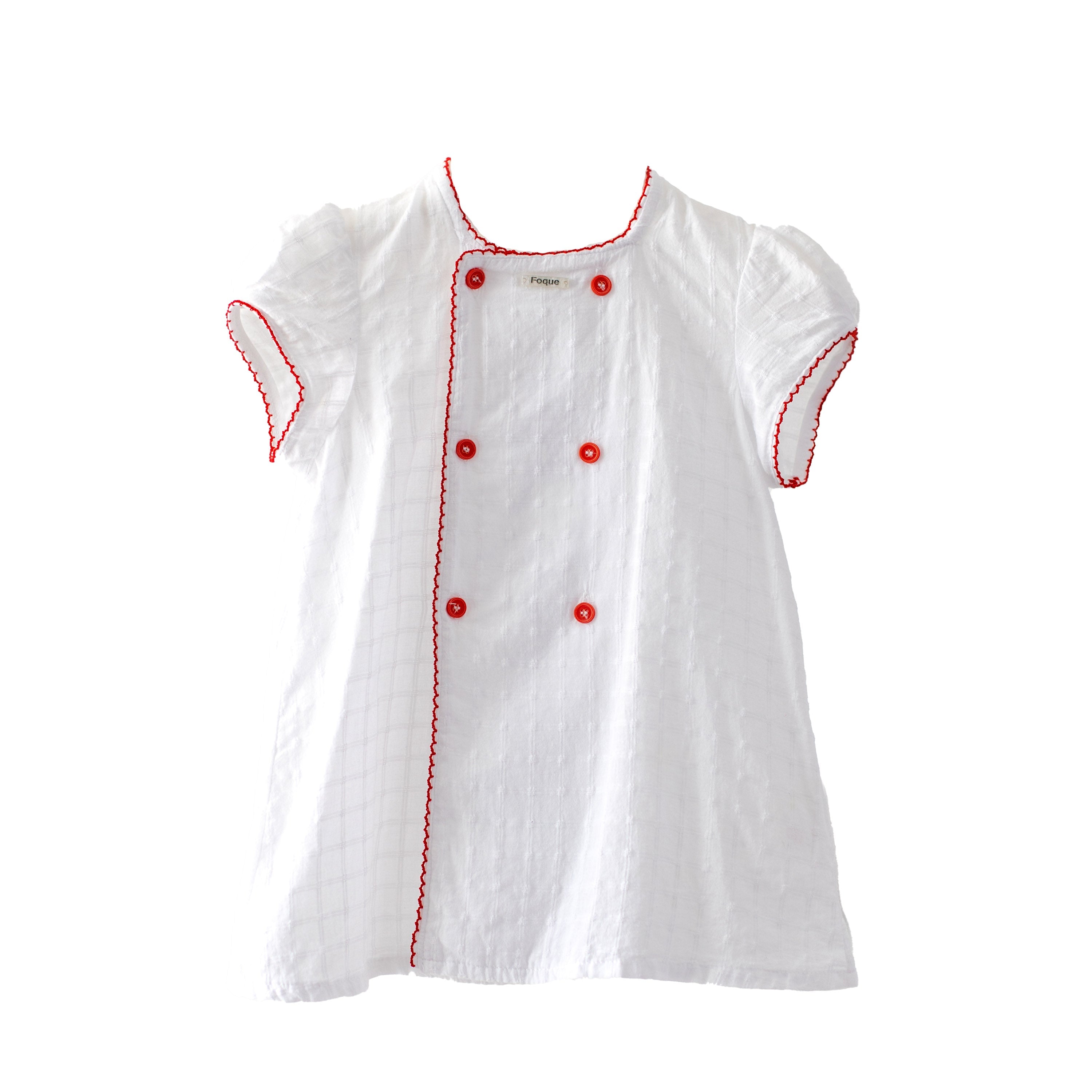 Baby girls white dress and red knicker set by Foque, made from smooth silky cotton with a delicate square fabric print. This sweet set has cotton lace trims and a 6 little red buttons in front. The dress is light weight and the knickers have soft, stretchy edges for a comfortable fit.