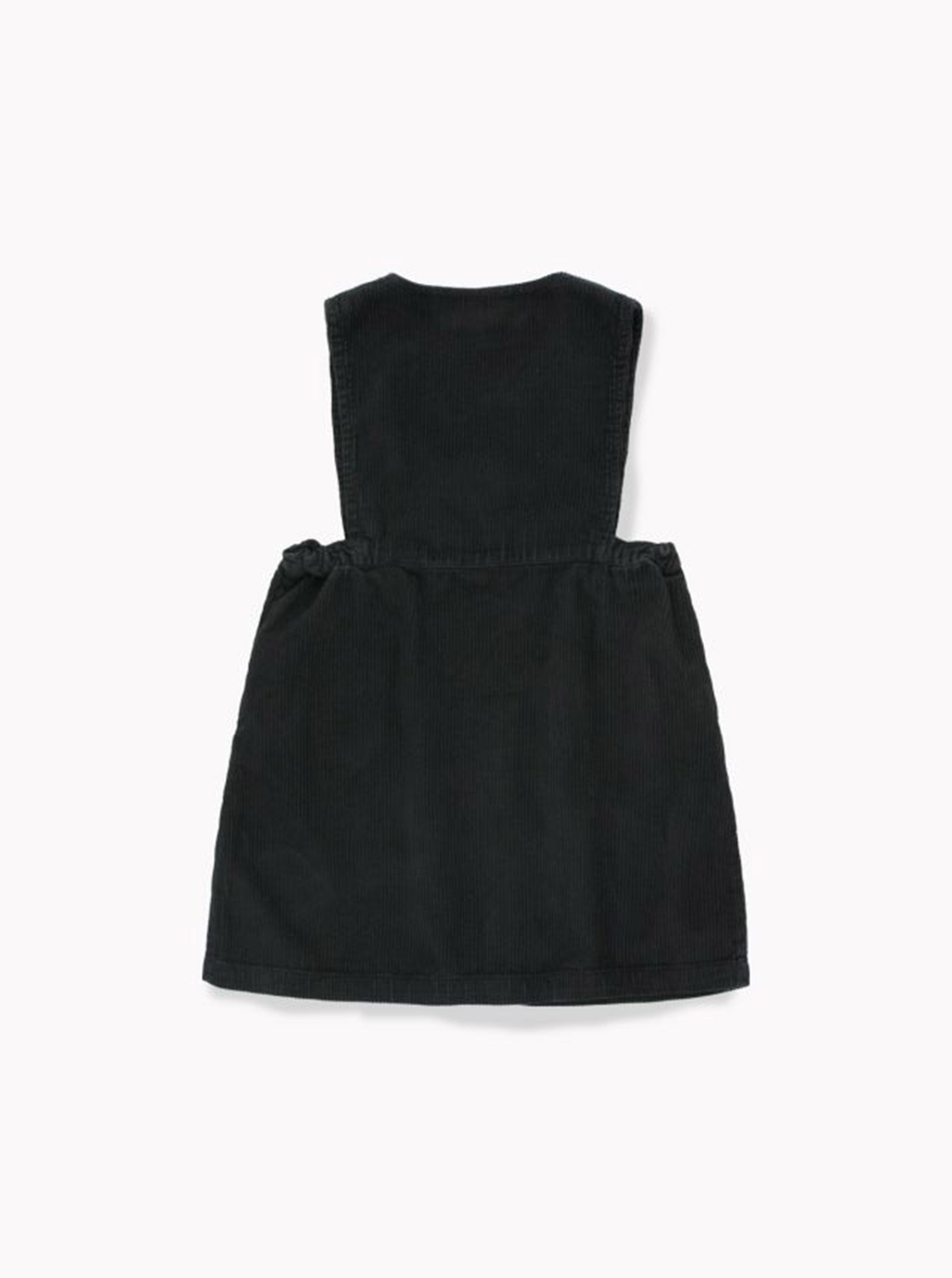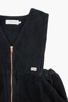 The Cord V-Neck Dress is a dress for kids. It comes with a "Tiny" embroidery on the front pocket to make you look cool and unique. The dress base color is black corduroy and it brings a front zip opening. V-neck. Elasticated waistband. 2 side pockets.